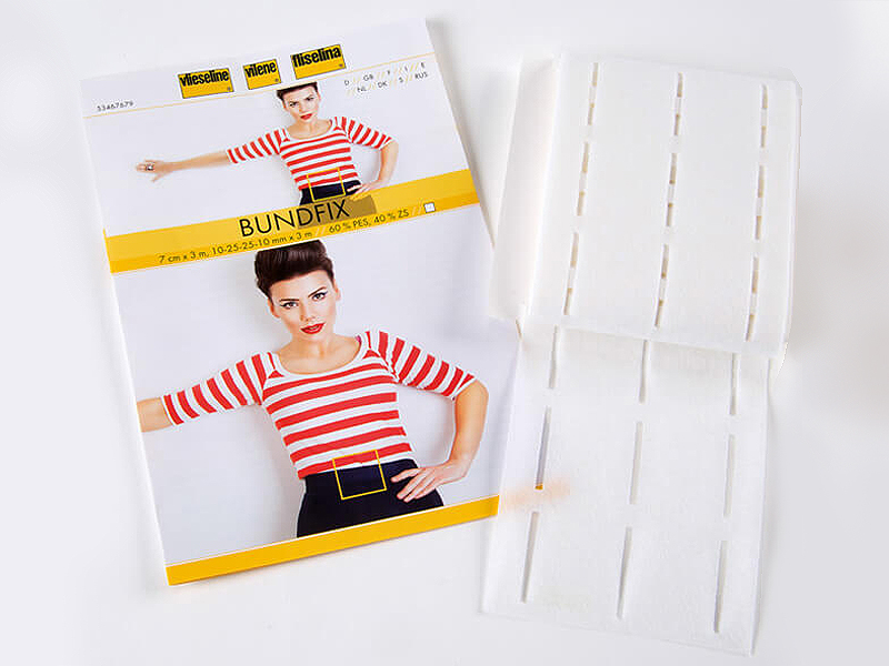 Mit Bundfix nähst Du Deiner Hose oder Deinem Rock einen akkuraten Bund – und das ohne aufwändiges Messen oder Bügeln. Sogar das Anzeichnen von Falzlinien gehört mit Bundfix der Vergangenheit an. Bundfix ist ein griffiges und stabiles Band aus Bügelvlies. Es besteht aus einem Gemisch aus Cellulose- und Polyesterfasern. Es ist 7 cm breit. In der Mitte sowie im Abstand von 1 cm zur Ober- und zur Unterkante ist eine perforierte Linie auf das Band aufgebracht. Entlang dieser Linie lässt sich der Stoff nach dem Aufbringen des Bügelvlieses später einfach umklappen. Damit sparst Du das aufwändige Bügeln entlang der Falzlinie. Der fertige Bund ist dann 2,5 cm breit