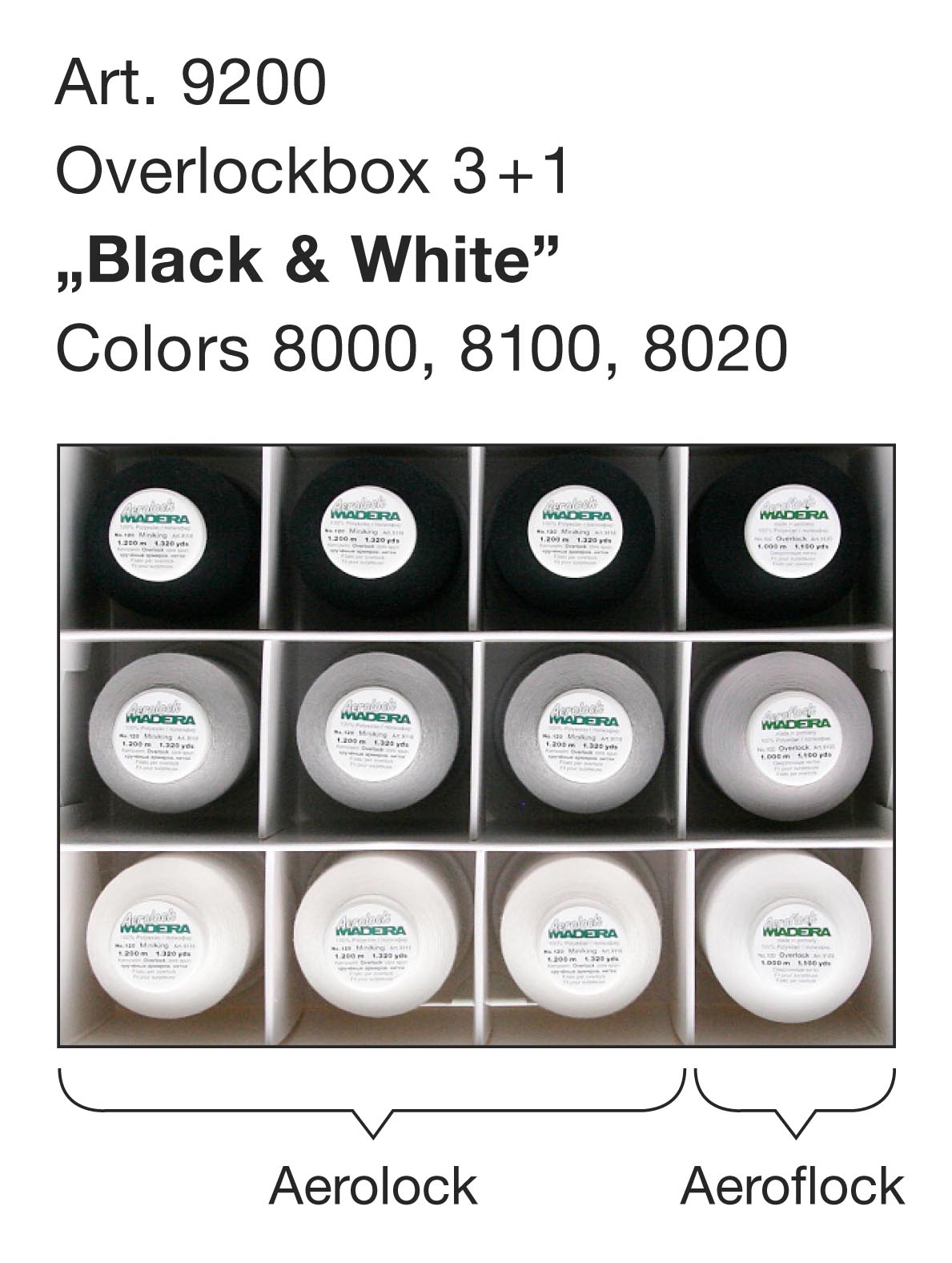 - Enthählt drei Farben Aerolock (9200, 9201, 9202) und das dazu farblich abgestimmte Bauschgarn Aeroflock