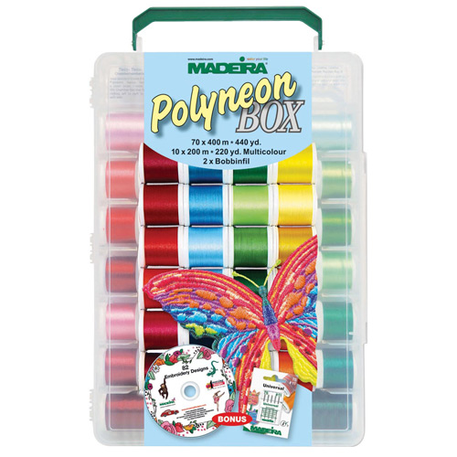 70 x 400m Polyneon No.40 + 10 x 200m Multicolor + 2 x 1500m Bobbinfl, 80 Farben + 1 CD mit 82 Designs + 1 Packung Universal Nadeln