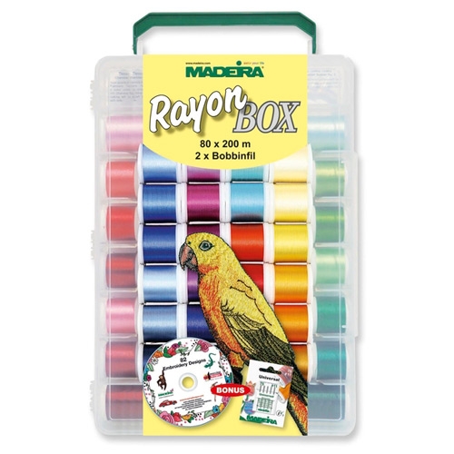 80 x 200m Rayon No.40; 80 Farben; 2 x 1500m Bobbinfil No.70; 1 Packung Universal Nadeln; 1 CD mit 82 Designs