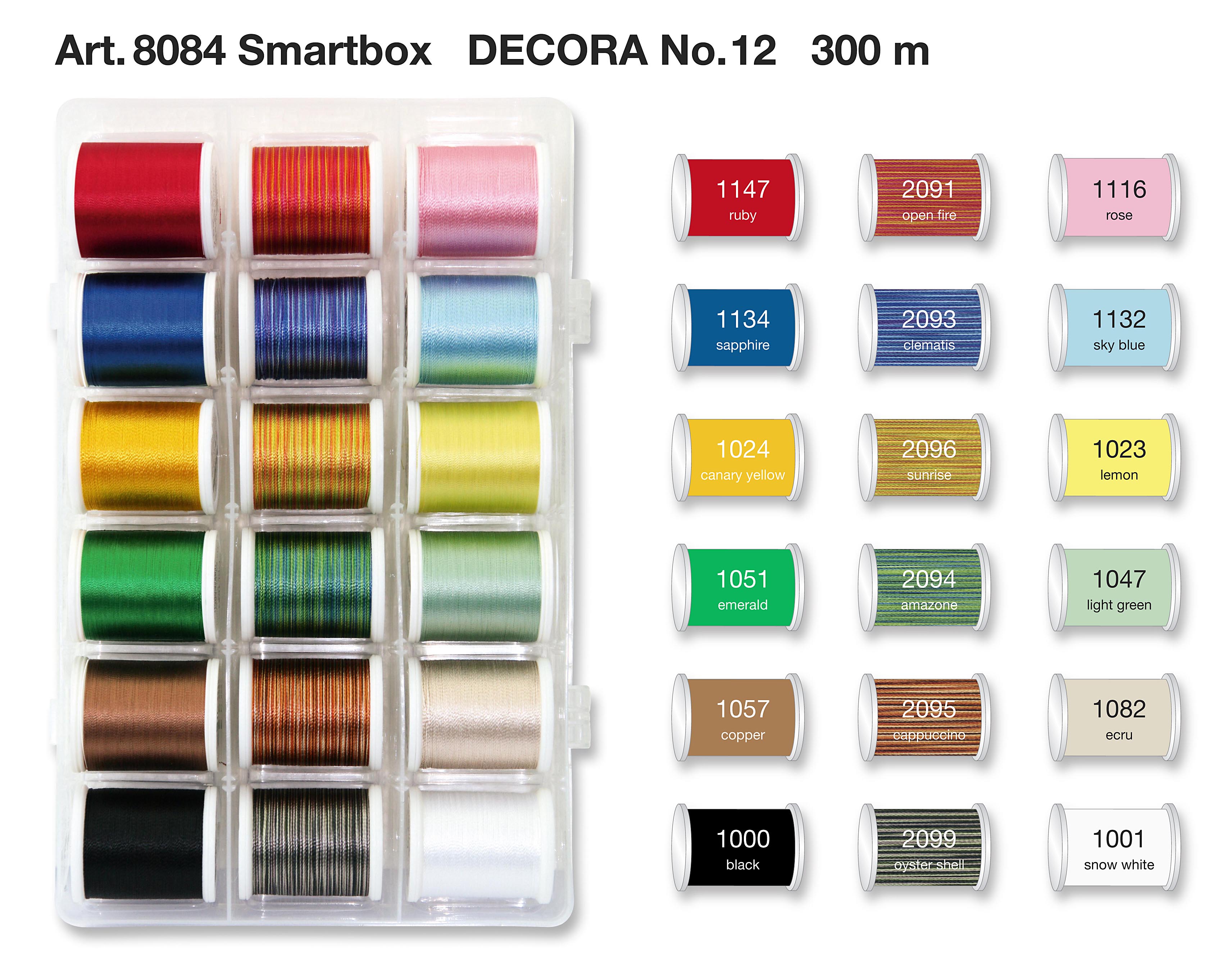 | Inhalt | 18 Spulen á 300m, Decora N°12 und Nadeln |