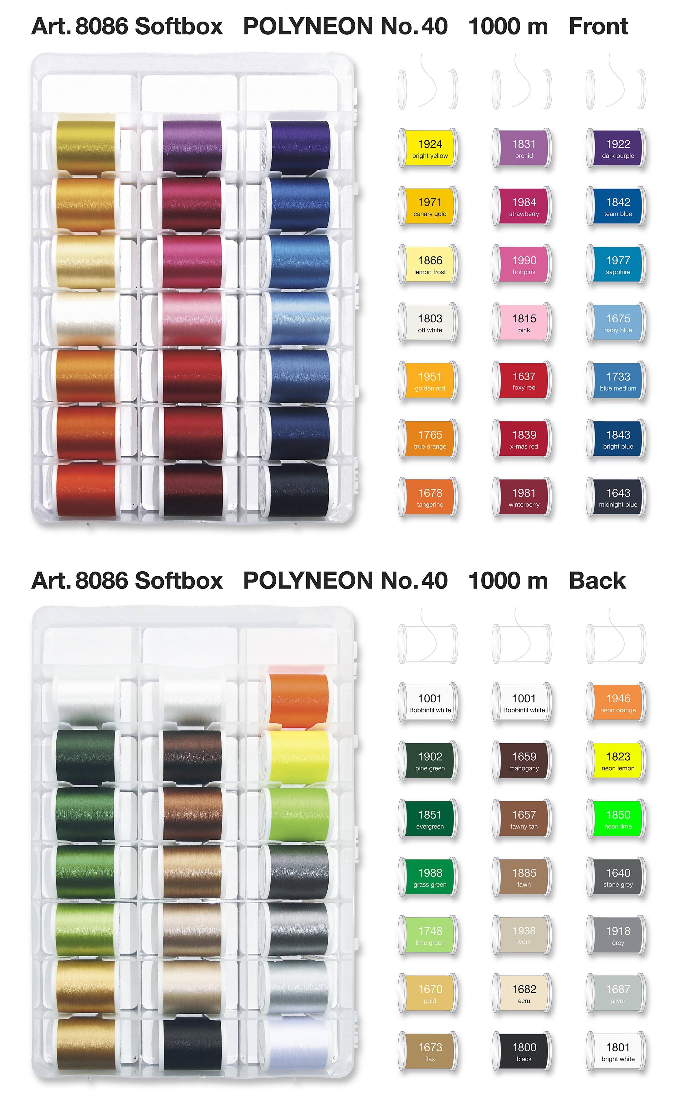 | Inhalt | 40 Spulen á 1000m Polyneon, 2 x 1000m Bobbinfil, Untergarn und Nadeln, 1 CD |