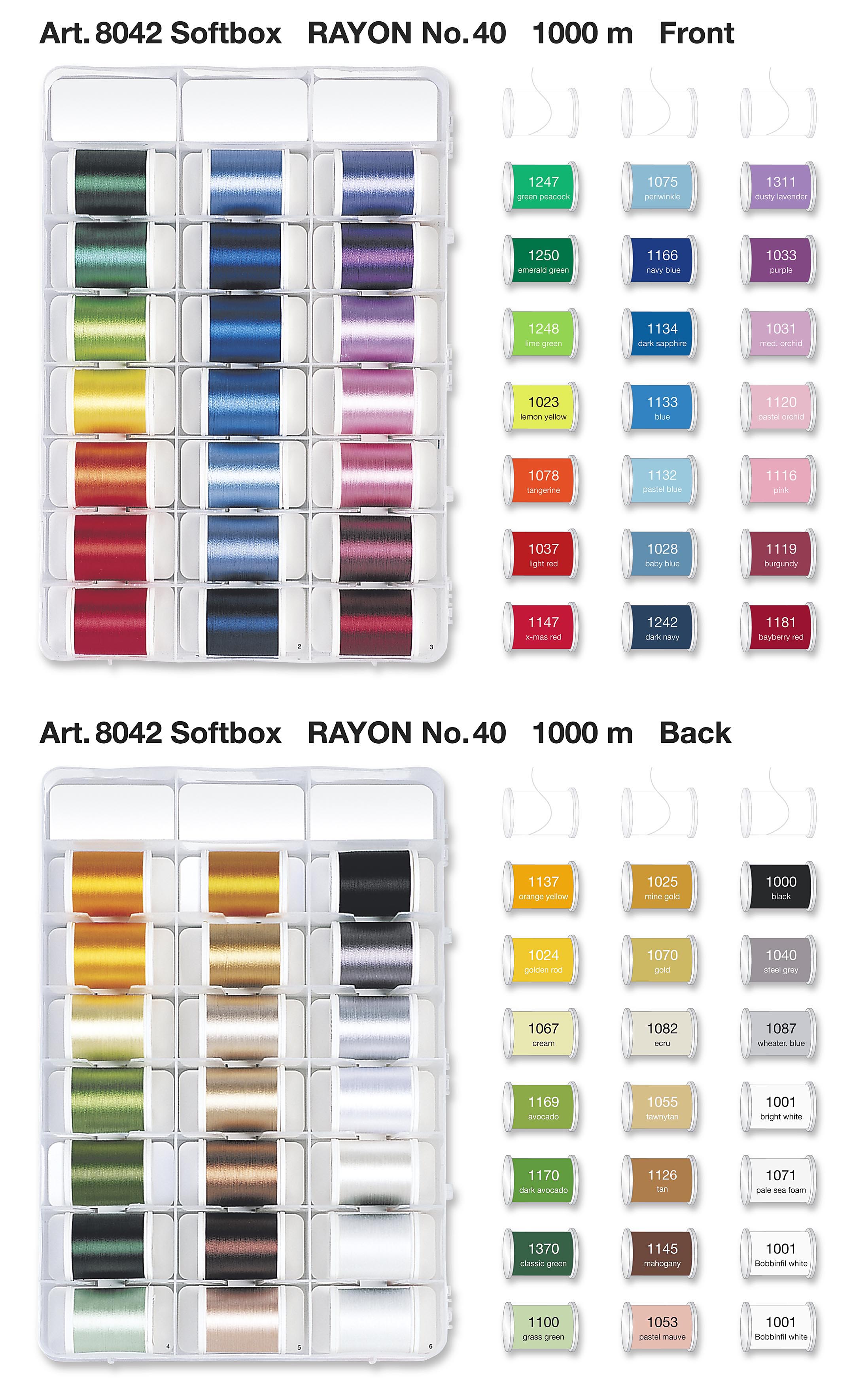 | Inhalt | 40 Spulen á 1000m Rayon, 2 x 1500m Bobbinfil, CD mit 82 Stickdesigns, Universal Sticknadeln |
